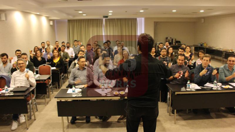 17 Kasım 2017 Cuma günü Best Western Şile Gardens’da 50 kişi ile ABB Elektrik ekibine yapmış olduğumuz Ritm Motivasyon Atölyesi etkinliği keyifli bir şekilde başladı. ABB Elektrik ekibi hiçbir şeyden habersiz bir şekilde alana geldiklerinde ne olacağını bilmeyen ABB Elektrik ekibi, etkinlik zamanı geldiğinde M3 Works asistanları tarafından dağıtılmaya başlanan enstrümanlar katılımcılara büyük sürpriz oldu. Başta enstrümanlarını inceleyen katılımcılar eğitmenimizin gelmesiyle etkinliğe başlandı. 3 gruba ayrılan katılımcılar 1. Grupta tef, 2. Grupta darbuka ve 3. Grupta marakas olmak üzere toplam üç çeşit enstrüman aletleri olan etkinlikte, eğitmenimiz önce ritim enstrümanlarını katılımcılara tanıtıp neler yapacaklarını anlattı. Başlangıçta biraz egzersiz yaptıran eğitmenimiz daha sonra müzik aletlerine geçti. Enstrümanların nasıl çalınacağını gösteren eğitmenimiz daha sonra katılımcılardan çalmasını istedi, ilk denemeleri çokta başarılı olmayan katılımcılar birkaç tekrardan sonra doğru ritmi bularak ve tek bir ses çıkararak ilk aşamayı başarıyla tamamladılar. Enstrümanlarla daha ileri bir seviyeye geçen katılımcılar zorluk seviyesini artırdılar, bu aşamalarında üstesinden takım olarak gelerek başarılı bir çalışma sergileyen katılımcılar, ritim enstrümanlarını çalmaya başladıkça etkinlikten daha da çok zevk almaya ve daha çok kenetlenmeye başladılar. Belirli bir seviyeye geldikten sonra ortaya çıkan kompozisyonu çalışan katılımcılar içlerindeki müzisyen ruhlarını ortaya çıkardılar. Eğitmenlerimizin bile hayran kaldığı katılımcılar beklentilerin üstünde bir performans sergileyerek eğitmenlerimizden büyük beğeni topladı. Takım olmanın, bir olmanın, birlikte zorlukların üstesinden ne kadar kolay bir şekilde geldiklerini tekrar tekrar hatırlayan katılımcılar Ritm Motivasyon Atölyesi etkinliğini başarı ile bitirmişlerdi. İşlerinde profesyonel olan eğitmenlerimiz katılımcılara vermek istedikleri onlara anlatmak istediklerini başarılı şekilde karşı tarafa iletmişlerdi. Müzik yapmak için takım olmanın önemini hatırlayan katılımcılar doğru ve istenilen müzikleri ortaya çıkarmaya başladılar. Sonlara yaklaşılırken artık tek bir vücut gibi hareket eden ABB Elektrik ekibi bir orkestra gibi ritim aletlerini çalıyorlardı.