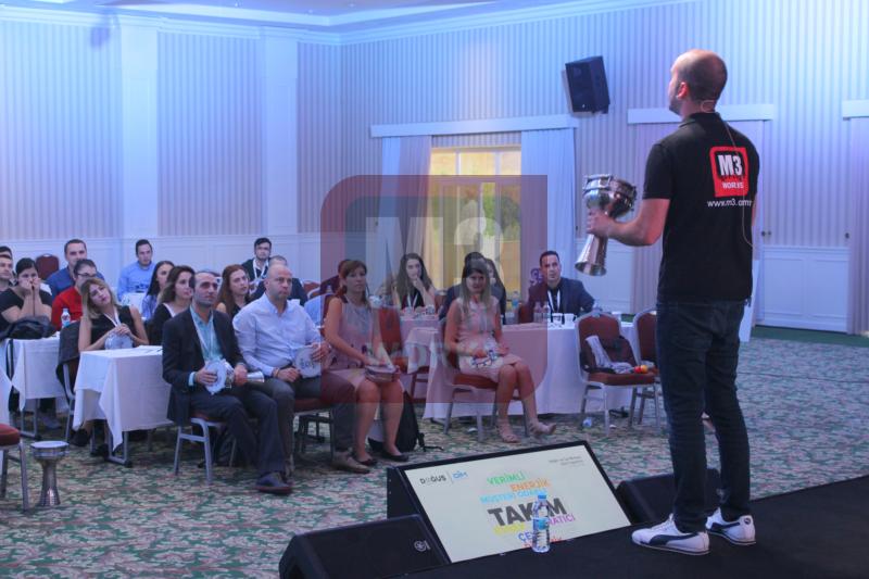 13 Ekim 2017 Salı günü İstanbul’da 80 kişilik ile Doğuş Otomotiv katılımcılarına yapmış olduğumuz Ritm Motivasyon Atölyesi etkinliği keyifli bir şekilde başladı. Doğuş Otomotiv katılımcıları hiçbir şeyden habersiz bir şekilde alana geldiklerinde ne olacağını bilmeyen Doğuş Otomotiv katılımcıları, etkinlik zamanı geldiğinde M3 Works asistanları tarafından dağıtılmaya başlanan enstrümanlar katılımcılara büyük sürpriz oldu. Başta enstrümanlarını inceleyen katılımcılar eğitmenimizin gelmesiyle etkinliğe başlandı. 3 gruba ayrılan katılımcılar 1. Grupta tef, 2. Grupta darbuka ve 3. Grupta marakas olmak üzere toplam üç çeşit enstrüman aletleri olan etkinlikte, eğitmenimiz önce ritim enstrümanlarını katılımcılara tanıtıp neler yapacaklarını anlattı. Başlangıçta biraz egzersiz yaptıran eğitmenimiz daha sonra müzik aletlerine geçti. Enstrümanların nasıl çalınacağını gösteren eğitmenimiz daha sonra katılımcılardan çalmasını istedi, ilk denemeleri çokta başarılı olmayan katılımcılar birkaç tekrardan sonra doğru ritmi bularak ve tek bir ses çıkararak ilk aşamayı başarıyla tamamladılar. Enstrümanlarla daha ileri bir seviyeye geçen katılımcılar zorluk seviyesini artırdılar, bu aşamalarında üstesinden takım olarak gelerek başarılı bir çalışma sergileyen katılımcılar, ritim enstrümanlarını çalmaya başladıkça etkinlikten daha da çok zevk almaya ve daha çok kenetlenmeye başladılar. Belirli bir seviyeye geldikten sonra ortaya çıkan kompozisyonu çalışan katılımcılar içlerindeki müzisyen ruhlarını ortaya çıkardılar. Eğitmenlerimizin bile hayran kaldığı katılımcılar beklentilerin üstünde bir performans sergileyerek eğitmenlerimizden büyük beğeni topladı. Takım olmanın, bir olmanın, birlikte zorlukların üstesinden ne kadar kolay bir şekilde geldiklerini tekrar tekrar hatırlayan katılımcılar Ritm Motivasyon Atölyesi etkinliğini başarı ile bitirmişlerdi. İşlerinde profesyonel olan eğitmenlerimiz katılımcılara vermek istedikleri onlara anlatmak istediklerini başarılı şekilde karşı tarafa iletmişlerdi. Müzik yapmak için takım olmanın önemini hatırlayan katılımcılar doğru ve istenilen müzikleri ortaya çıkarmaya başladılar. Sonlara yaklaşılırken artık tek bir vücut gibi hareket eden Doğuş Otomotiv katılımcıları bir orkestra gibi ritim aletlerini çalıyorlardı.