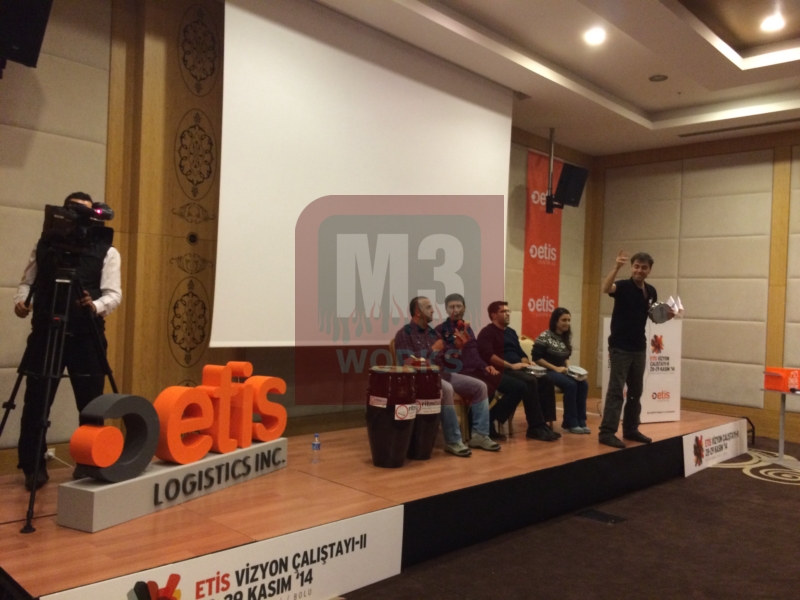 29 Kasım 2014 tarihinde Abant Palace Hotel’ de Etis Lojistik ekibi ile gerçekleştirilen Ritm Motivasyon Atölyesi etkinliği piknik konseptinde gerçekleştirildi. Saat 18:00’ da başlanılan etkinlikte, katılımcılar önce kahvaltılarını yaptılar. 1. Gruba tef 2. Gruba darbuka ve 3. Gruba marakas enstrümanları dağıtıldı. Eğitmenimiz enstrümanlar ile yaptığı kısa bir gösteri sonrasında katılımcılara enstrümanlar hakkında bilgiler verdi. Bu bilgiler sonrasında eğitmenimiz darbukadan başlayarak darbukaya vuruş tekniklerini anlattı ve katılımcılara nasıl darbuka çalınması gerektiğini göstererek birkaç tane vurma şekilleri gösterdi. Daha sonrasında tefe geçen eğitmenimiz aynı şekilde önce tefin çalınış şekillerini anlatan eğitmenimiz daha sonrasında tefin nasıl çalınması gerektiğini kısaca öğreterek marakasa geçti. Marakası da gösteren, anlatıp, öğreten eğitmenimiz önce grupları tek tek çalıştırdı. Darbuka grubu çaldıkları ritmlerle bir bütünlük yakalamayı başarınca sıra tef grubuna geldi, onlarda tek bir ses çıkarmayı başardı ve son olarak marakas grubuna gelmişti. Marakas grubu da birliği sağlamayı başarınca eğitmenimizin öncülüğüyle hep birlikte çalmaya çalışacaklardı. Hep birlikte çalmaya çalışan gruplar grup iççindeki gibi tek bir düzende gitmeye çalışıyorlardı. Birlikteliği sağlayan gruplar, bir ses çıkardıkça kulağa güzel bir müzik geldikçe yaptıkları etkinlikten de keyif almaya başlamışlardı.