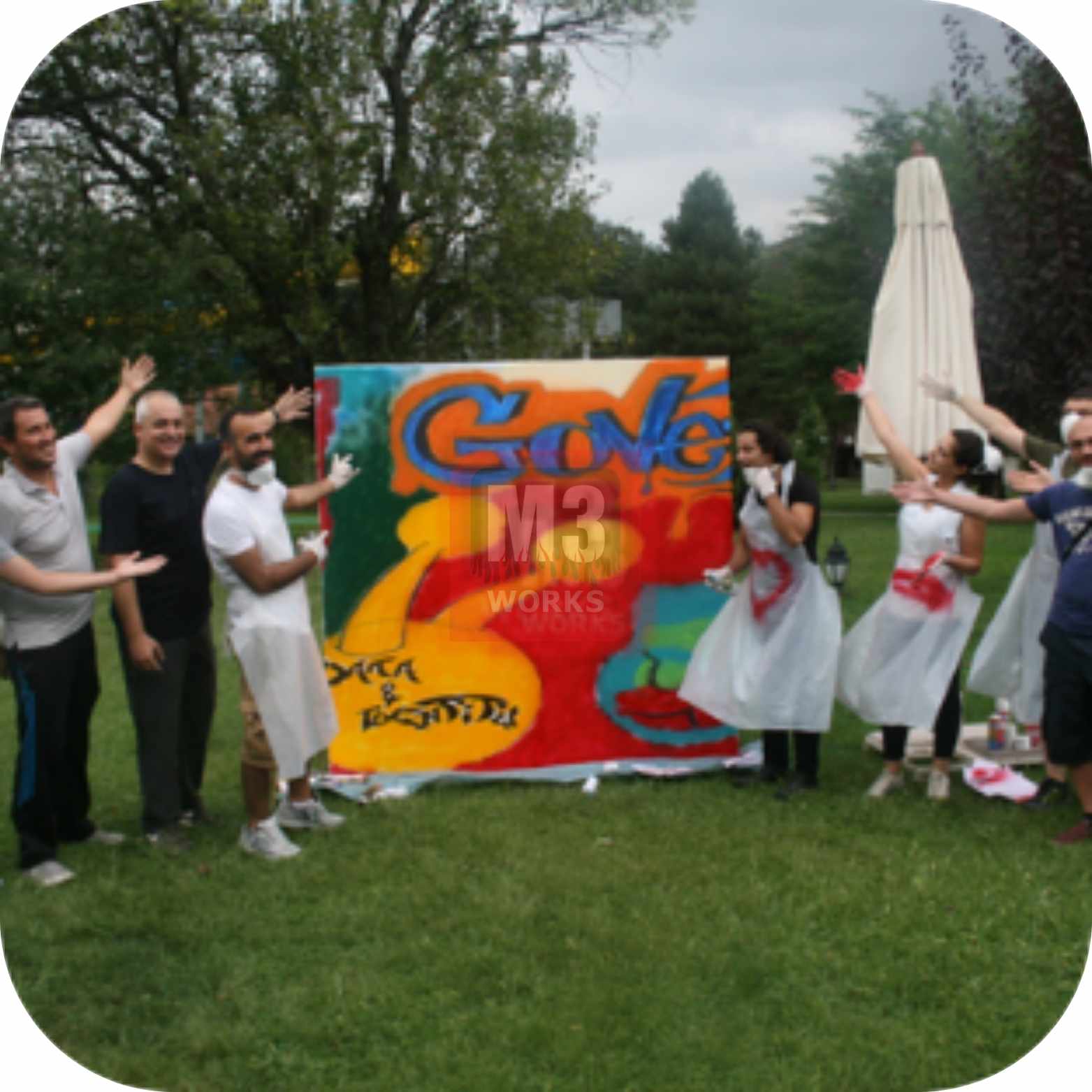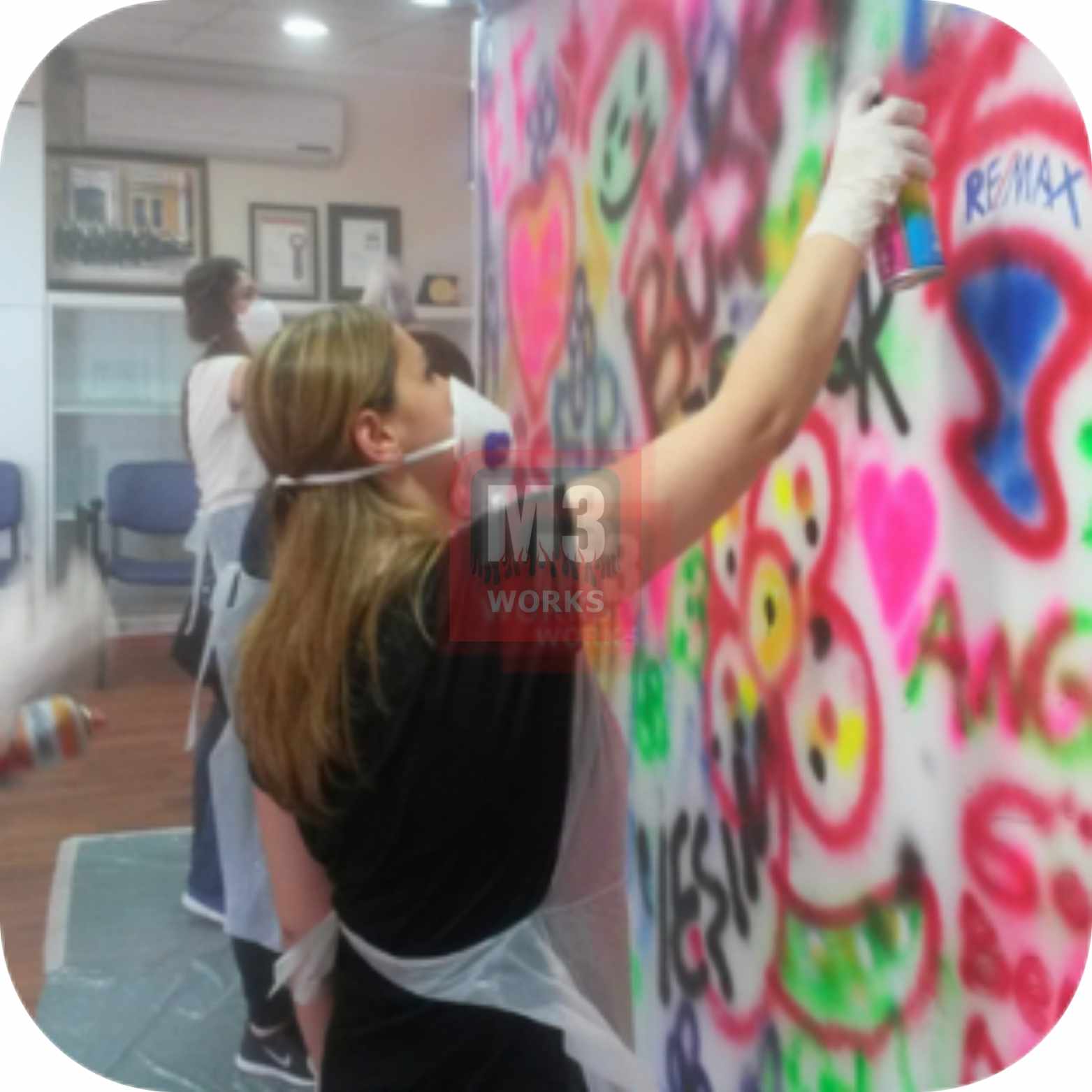 Profesyonel graffiti sanatçımızdan alınan kısa ve ilham verici eğitimin ardından takımlar, sprey boyalarını ellerine alır ve devasa bir duvarı birlikte boyamaya başlar. Merak etmeyin; yasal izin gerektirmeyen, tamamen size özel ve güvenli mobil graffiti duvarımızı biz getiriyoruz.