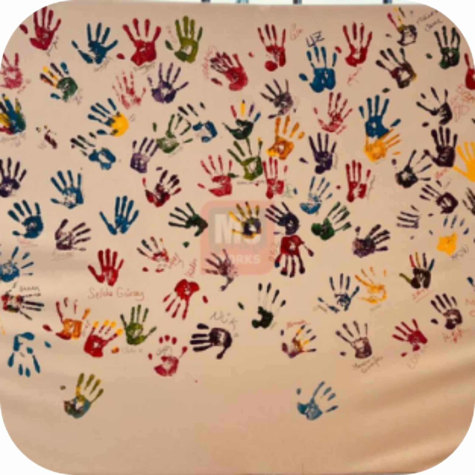 Açık veya kapalı alanlarda kurulabilen özel tablomuzda katılımcılar; kolayca çıkan, cilde zarar vermeyen rengârenk boyalarla ister çıplak elle ister eldiven kullanarak el izlerini bırakır. Her iz, ortak hedefe atılmış somut bir imza niteliği taşır. Ortaya çıkan eser, ekiplerin “biz buradayız” mesajını güçlü bir görselle ifade eder.