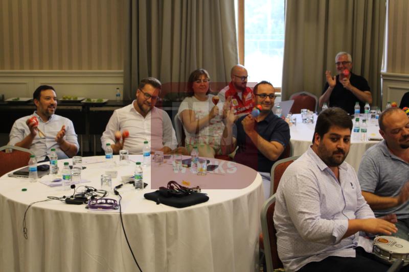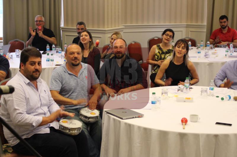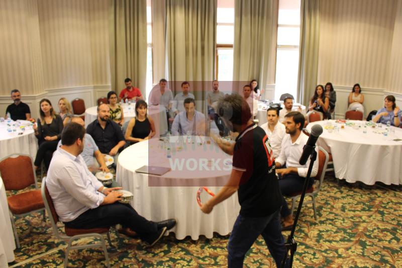 28 Haziran 2018 Perşembe günü, Şile Garden Otel’de 50 kişilik Shell çalışanları ile Ritmbox Ritim Atölyesi aktivitesi keyif dolu bir şekilde başladı. O gün Shell ekibi için güzel ve eğlenceli bir gün başlıyordu. Shell ekibi hiçbir şeyden habersiz etkinliğin olduğu alanına geldiler, burada ne yapacakları hakkında çok fazla fikir yürüten katılımcılar alanda oturacakları yerlerdeki müzik enstrümanlarını gördüler. İlk önce enstrümanlarını inceleyen katılımcılar daha sonrasında ise eğitmenimizin gelmesiyle etkinliğe başlanmış oldu. 3 gruba ayrılan katılımcılar 1. Grupta tef, 2. Grupta darbuka ve 3. Grupta marakas olmak üzere toplam üç çeşit müzik enstrüman aletleri dağıtıldı, eğitmenimiz önce ritim enstrümanlarını katılımcılara tanıtıp neler yapacaklarını anlattı. Başlangıçta biraz egzersiz yaptıran eğitmenimiz daha sonra müzik aletlerine geçti. Enstrümanların nasıl çalınacağını gösteren eğitmenimiz daha sonra katılımcılardan çalmasını istedi, ilk denemeleri çokta başarılı bir performans sergileyemeyen katılımcılar birkaç tekrardan sonra doğru ritmi bulup tek bir ses çıkararak ilk aşamayı başarıyla tamamladılar. Üzerlerindeki o çekingen havadan kurtulan katılımcılar artık tam olarak kendilerini etkinliğe verebiliyorlardı. Takım olmanın, birlikte hareket etmenin ve motivasyonu hep yüksek tutmanın formülünü keşfeden Shell ekibi artık Ritmbox Ritim Atölyesi etkinliğini daha sağlıklı bir şekilde gerçekleştiriyorlardı. Enstrümanlarla daha ileri bir seviyeye geçen katılımcılar biraz daha zorlu aşamaya geçtiler, bu aşamalarında üstesinden takım olarak gelerek başarılı bir çalışma sergileyen katılımcılar, ritim enstrümanlarını çalmaya başladıkça etkinlikten daha da çok zevk almaya ve daha çok kenetlenmeye başladılar. Belirli bir seviyeye geldikten sonra ortaya çıkan bir ritim kompozisyonu çalışan katılımcılar içlerindeki müzisyen ruhlarını ortaya çıkardılar. Katılımcılar beklentilerin üstünde bir performans sergileyerek eğitmenlerimizden büyük beğeni topladı.